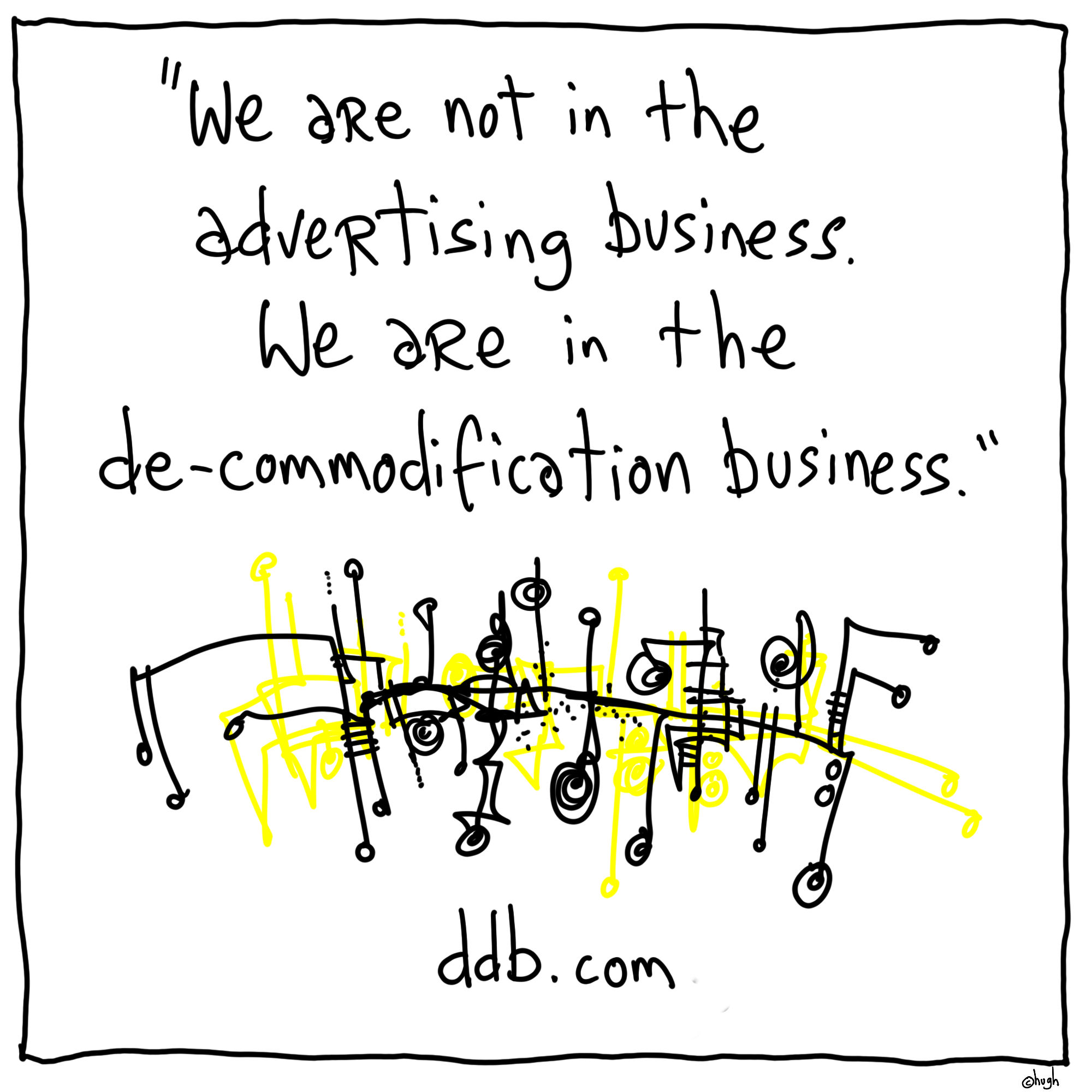 “… the research spit out this tepid little storyboard that both research and the client had approved. There on the conveyer belt lay the TV spot—a trembling, pathetic thing that did not like being looked at directly. A sort of marketing Frankenstein—chunks of different departmental agendas and man-dates, all sewn together by focus groups and researchers into some-thing that looked like a TV spot but was, in fact, an abomination. We should have hammered a spike through its heart right there.”